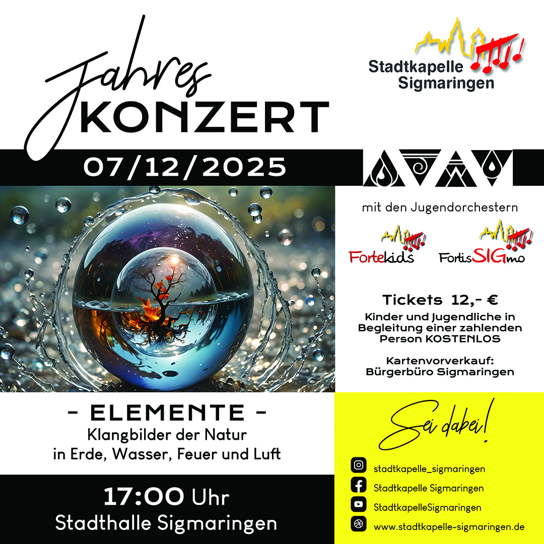 Feuer, Wasser, Erde und Luft – die vier Elemente sind nicht nur Grundlage allen Lebens, sondern auch Inspirationsquelle für eine Vielzahl musikalischer Werke. Die Stadtkapelle Sigmaringen widmet ihr diesjähriges Jahreskonzert am Sonntag, den 07. Dezember 2025, um 17 Uhr in der Stadthalle Sigmaringen ganz diesen elementaren Kräften und lädt gemeinsam mit dem Vororchester Fortekids und der Jugendkapelle FortisSIGmo zu einem abwechslungsreichen Abend ein.