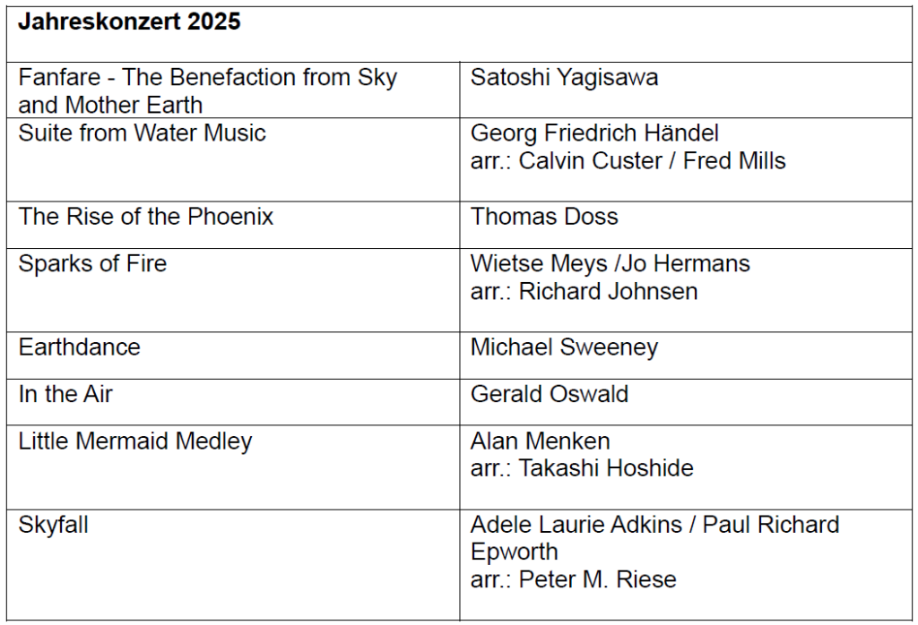 Unser Konzertprogramm ist überwiegend von der sinfonischen Blasmusik geprägt. Immer wieder versuchen wir uns und unserem Publikum erneut die Vielseitigkeit des Genres und unseres Klangkörpers unter Beweis zu stellen. Von Originalliteratur für Blasorchester, klassischen Arrangements bis hin zu modernen Transkriptionen aus Film oder dem Musical ist bei uns für jeden Geschmack etwas Passendes zu finden.